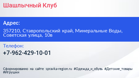 Шашлычный Клуб по адресу 357210, Ставропольский край, Минеральные Воды, Советская улица, 10в в дальнейшем Организация, размещена в следующих категориях: