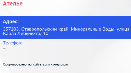 Ателье по адресу 357203, Ставропольский край, Минеральные Воды, улица Карла Либкнехта, 10 в дальнейшем Организация, размещена в следующих категориях: