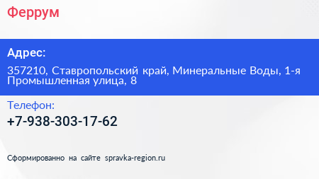 Феррум по адресу 357210, Ставропольский край, Минеральные Воды, 1-я Промышленная улица, 8 в дальнейшем Организация, размещена в следующих категориях: