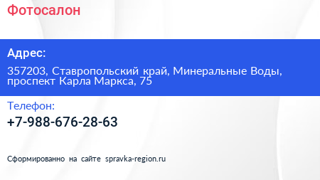 Фотосалон по адресу 357203, Ставропольский край, Минеральные Воды, проспект Карла Маркса, 75 в дальнейшем Организация, размещена в следующих категориях: