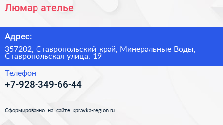 Люмар, ателье по адресу 357202, Ставропольский край, Минеральные Воды, Ставропольская улица, 19 в дальнейшем Организация, размещена в следующих категориях: