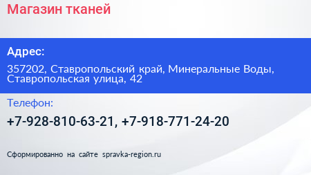 Магазин тканей по адресу 357202, Ставропольский край, Минеральные Воды, Ставропольская улица, 42 в дальнейшем Организация, размещена в следующих категориях: