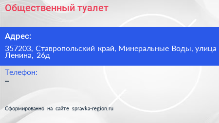 Общественный туалет по адресу 357203, Ставропольский край, Минеральные Воды, улица Ленина, 26д в дальнейшем Организация, размещена в следующих категориях: