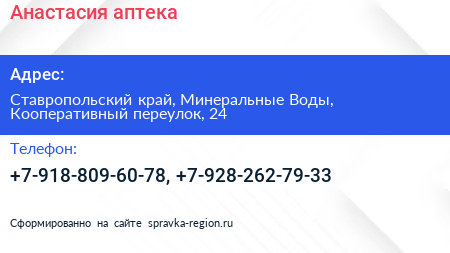 Анастасия, аптека по адресу Ставропольский край, Минеральные Воды, Кооперативный переулок, 24 в дальнейшем Организация, размещена в следующих категориях: