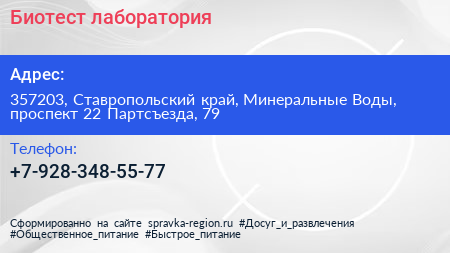 Биотест, лаборатория по адресу 357203, Ставропольский край, Минеральные Воды, проспект 22 Партсъезда, 79 в дальнейшем Организация, размещена в следующих категориях: