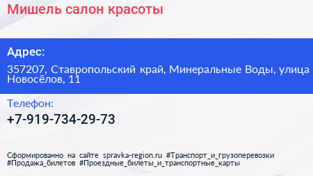 Мишель, салон красоты по адресу 357207, Ставропольский край, Минеральные Воды, улица Новосёлов, 11 в дальнейшем Организация, размещена в следующих категориях: