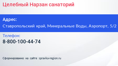 Целебный Нарзан, санаторий по адресу Ставропольский край, Минеральные Воды, Аэропорт, 5/2 в дальнейшем Организация, размещена в следующих категориях: