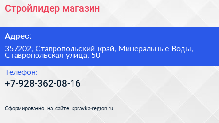 Стройлидер, магазин по адресу 357202, Ставропольский край, Минеральные Воды, Ставропольская улица, 50 в дальнейшем Организация, размещена в следующих категориях: