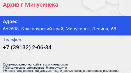 Архив г. Минусинска по адресу 662608, Красноярский край, Минусинск, Ленина, 68 в дальнейшем Организация, размещена в следующих категориях: