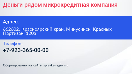 Деньги рядом, микрокредитная компания по адресу 662602, Красноярский край, Минусинск, Красных Партизан, 120а в дальнейшем Организация, размещена в следующих категориях: