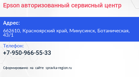 Epson, авторизованный сервисный центр по адресу 662610, Красноярский край, Минусинск, Ботаническая, 43/1 в дальнейшем Организация, размещена в следующих категориях: