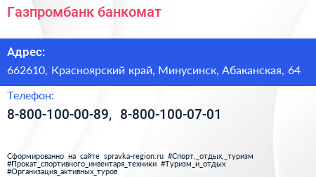 Газпромбанк, банкомат по адресу 662610, Красноярский край, Минусинск, Абаканская, 64 в дальнейшем Организация, размещена в следующих категориях: