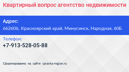 Квартирный вопрос, агентство недвижимости по адресу 662606, Красноярский край, Минусинск, Народная, 60Б в дальнейшем Организация, размещена в следующих категориях: