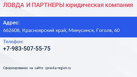 ЛОВДА И ПАРТНЕРЫ, юридическая компания по адресу 662608, Красноярский край, Минусинск, Гоголя, 60 в дальнейшем Организация, размещена в следующих категориях: