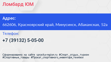 Ломбард ЮМ по адресу 662606, Красноярский край, Минусинск, Абаканская, 52а в дальнейшем Организация, размещена в следующих категориях: