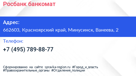 Росбанк, банкомат по адресу 662603, Красноярский край, Минусинск, Ванеева, 2 в дальнейшем Организация, размещена в следующих категориях:
