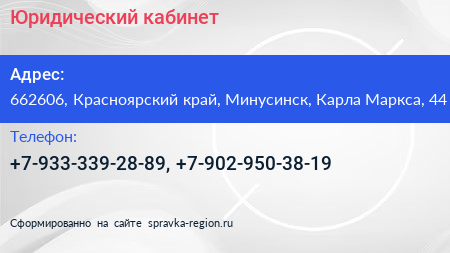 Юридический кабинет по адресу 662606, Красноярский край, Минусинск, Карла Маркса, 44 в дальнейшем Организация, размещена в следующих категориях: