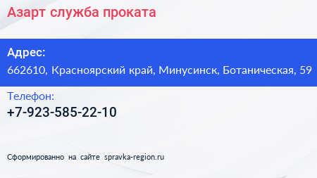 Азарт, служба проката по адресу 662610, Красноярский край, Минусинск, Ботаническая, 59 в дальнейшем Организация, размещена в следующих категориях: