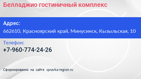 Белладжио, гостиничный комплекс по адресу 662610, Красноярский край, Минусинск, Кызыльская, 10 в дальнейшем Организация, размещена в следующих категориях: