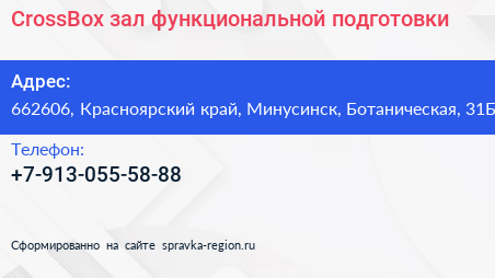 CrossBox, зал функциональной подготовки по адресу 662606, Красноярский край, Минусинск, Ботаническая, 31Б в дальнейшем Организация, размещена в следующих категориях: