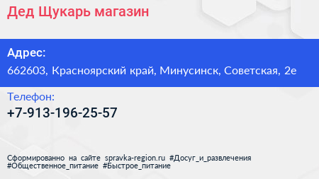Дед Щукарь, магазин по адресу 662603, Красноярский край, Минусинск, Советская, 2е в дальнейшем Организация, размещена в следующих категориях: