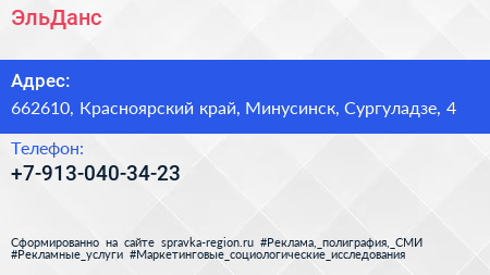 ЭльДанс по адресу 662610, Красноярский край, Минусинск, Сургуладзе, 4 в дальнейшем Организация, размещена в следующих категориях: