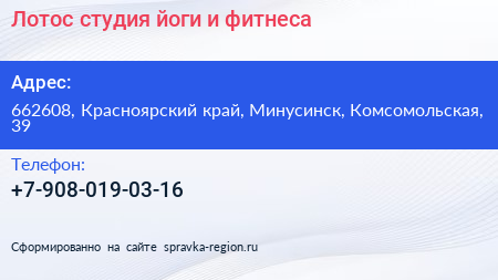 Лотос, студия йоги и фитнеса по адресу 662608, Красноярский край, Минусинск, Комсомольская, 39 в дальнейшем Организация, размещена в следующих категориях: