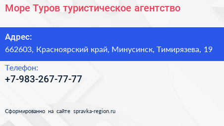Море Туров, туристическое агентство по адресу 662603, Красноярский край, Минусинск, Тимирязева, 19 в дальнейшем Организация, размещена в следующих категориях:
