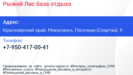 Рыжий Лис, база отдыха по адресу Красноярский край, Минусинск, Песочная (Спартак), 9 в дальнейшем Организация, размещена в следующих категориях: