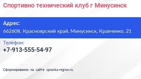 Спортивно-технический клуб, г. Минусинск по адресу 662608, Красноярский край, Минусинск, Кравченко, 21 в дальнейшем Организация, размещена в следующих категориях:
