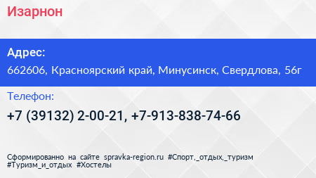 Изарнон по адресу 662606, Красноярский край, Минусинск, Свердлова, 56г в дальнейшем Организация, размещена в следующих категориях: