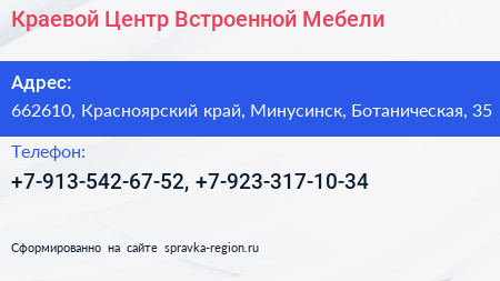 Краевой Центр Встроенной Мебели по адресу 662610, Красноярский край, Минусинск, Ботаническая, 35 в дальнейшем Организация, размещена в следующих категориях: