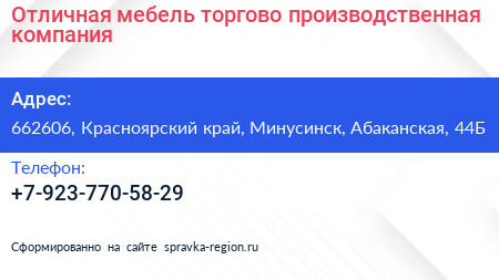 Отличная мебель, торгово-производственная компания по адресу 662606, Красноярский край, Минусинск, Абаканская, 44Б в дальнейшем Организация, размещена в следующих категориях:
