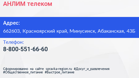 АНЛИМ телеком по адресу 662603, Красноярский край, Минусинск, Абаканская, 43Б в дальнейшем Организация, размещена в следующих категориях: