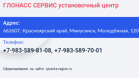 ГЛОНАСС СЕРВИС, установочный центр по адресу 662607, Красноярский край, Минусинск, Молодёжная, 120 в дальнейшем Организация, размещена в следующих категориях: