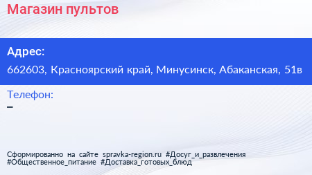 Магазин пультов по адресу 662603, Красноярский край, Минусинск, Абаканская, 51в в дальнейшем Организация, размещена в следующих категориях: