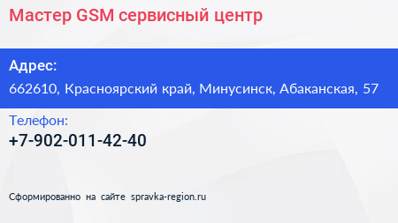 Мастер GSM, сервисный центр по адресу 662610, Красноярский край, Минусинск, Абаканская, 57 в дальнейшем Организация, размещена в следующих категориях: