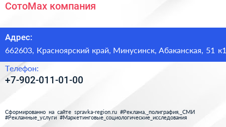 СотоMах, компания по адресу 662603, Красноярский край, Минусинск, Абаканская, 51 к1 в дальнейшем Организация, размещена в следующих категориях: