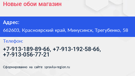 Новые обои, магазин по адресу 662603, Красноярский край, Минусинск, Трегубенко, 58 в дальнейшем Организация, размещена в следующих категориях:
