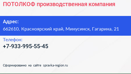 ПОТОЛКОФ, производственная компания по адресу 662610, Красноярский край, Минусинск, Гагарина, 21 в дальнейшем Организация, размещена в следующих категориях: