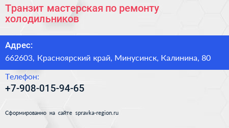 Транзит, мастерская по ремонту холодильников по адресу 662603, Красноярский край, Минусинск, Калинина, 80 в дальнейшем Организация, размещена в следующих категориях:
