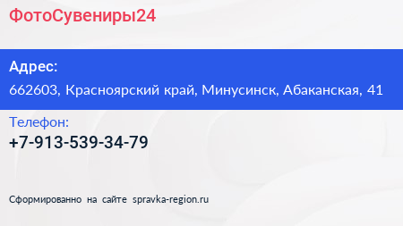 ФотоСувениры24 по адресу 662603, Красноярский край, Минусинск, Абаканская, 41 в дальнейшем Организация, размещена в следующих категориях: