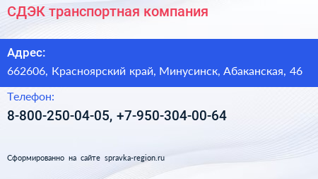 СДЭК, транспортная компания по адресу 662606, Красноярский край, Минусинск, Абаканская, 46 в дальнейшем Организация, размещена в следующих категориях:
