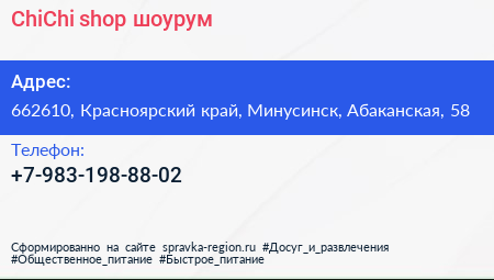 ChiChi shop, шоурум по адресу 662610, Красноярский край, Минусинск, Абаканская, 58 в дальнейшем Организация, размещена в следующих категориях: