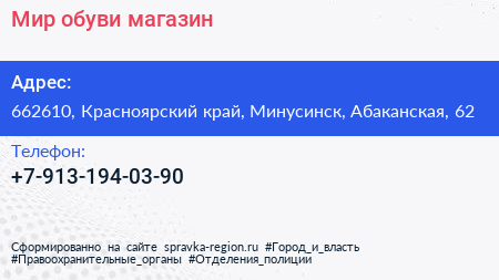 Мир обуви, магазин по адресу 662610, Красноярский край, Минусинск, Абаканская, 62 в дальнейшем Организация, размещена в следующих категориях:
