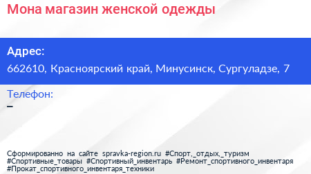 Мона, магазин женской одежды по адресу 662610, Красноярский край, Минусинск, Сургуладзе, 7 в дальнейшем Организация, размещена в следующих категориях: