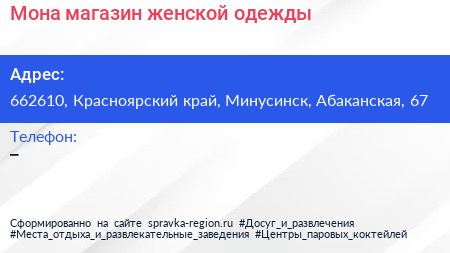 Мона, магазин женской одежды по адресу 662610, Красноярский край, Минусинск, Абаканская, 67 в дальнейшем Организация, размещена в следующих категориях: