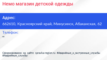 Немо, магазин детской одежды по адресу 662610, Красноярский край, Минусинск, Абаканская, 62 в дальнейшем Организация, размещена в следующих категориях: