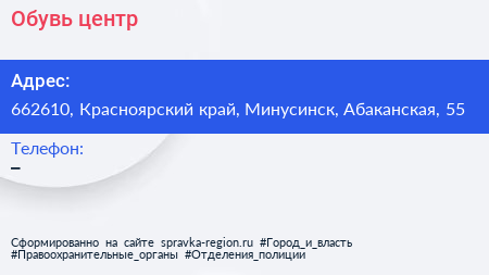 Обувь-центр по адресу 662610, Красноярский край, Минусинск, Абаканская, 55 в дальнейшем Организация, размещена в следующих категориях: