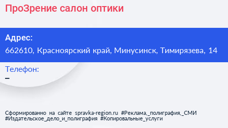ПроЗрение, салон оптики по адресу 662610, Красноярский край, Минусинск, Тимирязева, 14 в дальнейшем Организация, размещена в следующих категориях: